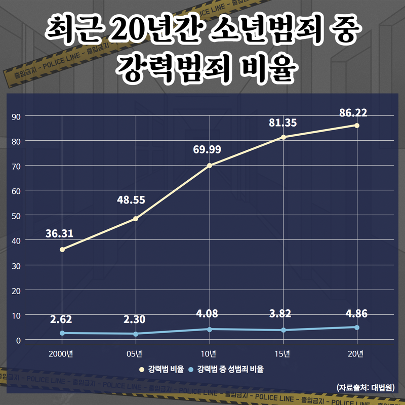 소년 강력범죄 비율도 2005년 평균 2.3% 수준이었으나 최근 4.86%에 달했습니다. 그 중에서도 강력범죄 중 성범죄 비율은 2000년 36.3%에서 2020년 86.2%로 급증했습니다.