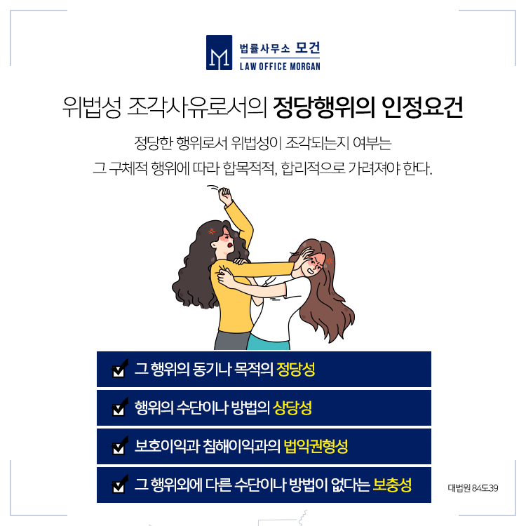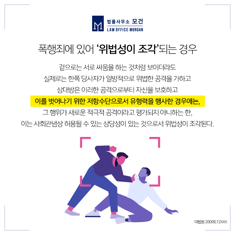 다만, 한쪽 당사자가 일방적으로 위법한 공격을 가하고 상대방은 이러한 공격으로부터 자신을 보호하고 이를 벗어나기 위한 저항수단으로서 유형력을 행사한 것이라면, 그 행위가 새로운 적극적 공격이라 평가되지 않는 한 정당방위로서 위법성이 조각될 수 있습니다. 이를 판단하기 위해서는 폭행 경위, 폭행의 방법과 강도, 피해정도 등 여러가지가 종합적으로 고려되어야 합니다.