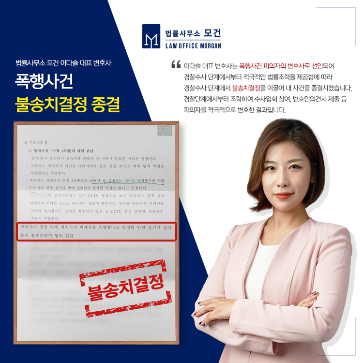 법률사무소 모건의 이다슬 대표 변호사는 형사전문변호사로서 다양한 케이스의 폭행 사건을 맡아왔으며, 폭행 혐의를 받고 있는 피의자를 법률대리하여 경찰단계에서 무혐의의 불송치결정을 이끌어낸 바 있습니다. 종로, 마포, 강남 등 도움이 필요하신 분들은 법률사무소 모건으로 문의하시기 바랍니다.