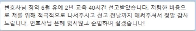 이번에 잠시 미끄러졌을 뿐, 워낙 성실하고 선량한 성품을 가진 의뢰인이었기에 이 사건의 결과가 더욱 반가웠습니다. 법원 앞에서 본인 재판 시각이 얼마 안 남았는데도 귀가 어두우신 할머님의 길 안내를 해 주느라 30분 넘게 고생하던 의뢰인분의 모습이 오래도록 기억에 남을 것 같습니다. 부디 앞으로는 이런 일에 절대 연루되지 마시고 행복하게 사시길 기원합니다.