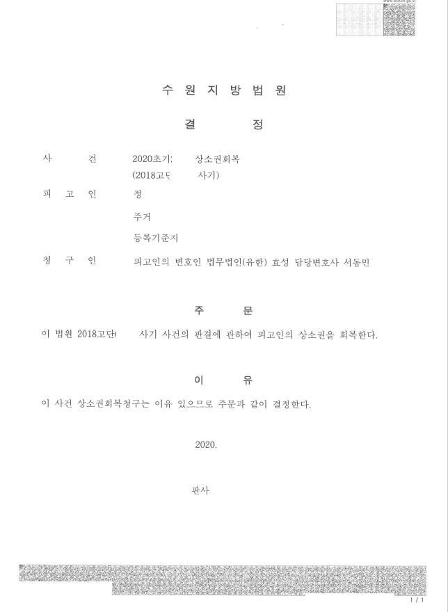 저는 상소권회복사건 심문기일에 출석하여 이 사건의 전체적인 경위, 의뢰인이 법원 연락을 받고도 재판에 나가지 않은 것은 분명 잘못이나 의뢰인이 법에 무지한 일반인이어서 잘 모른 점, 피해자와 일부 변제가 된 점 등을 중점적으로 변호하여 상소권회복 인용결정을 받았습니다.