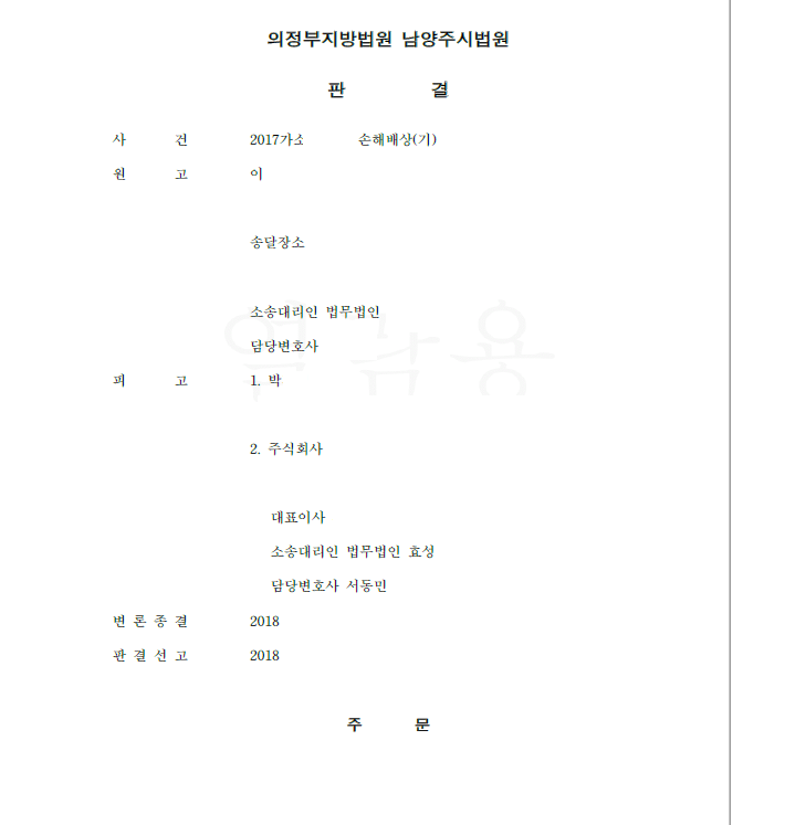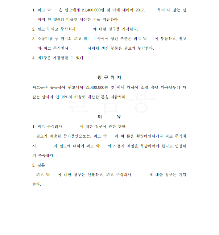 저는 회사를 소송대리하여 즉각 답변서 및 준비서면을 제출하면서 피해자가 직원과 합의하여 돈을 빌려준 것이므로 직무집행관련성이 없고 가사 직무집행관련성을 넓게 본다 하더라도 피해자는 직원의 행위가 직무집행관련성이 없음을 알았거나 중대한 과실로 알지 못한 경우이므로 회사의 사용자책임이 성립하지 않는다고 주장 입증하였습니다. 결국 법원은 저희의 주장을 모두 받아들여 원고 전부 패소 판결을 선고하였습니다.
