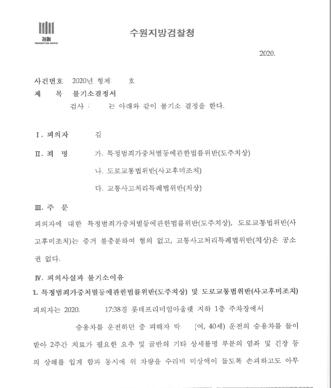 의뢰인은 쇼핑몰 지하주차장에서 운전을 하다 피해자의 차량을 가볍게 들이받고 차에 타고 있던 피해자에게 경미한 상해를 입혔으나 즉시 정차하고 구호조치 등의 의무를 하지 않은채 그대로 주차장을 빠져나가 특가법위반(도주치상), 도로교통법위반(사고후미조치), 교특법위반의 피의사실로 입건되었습니다.