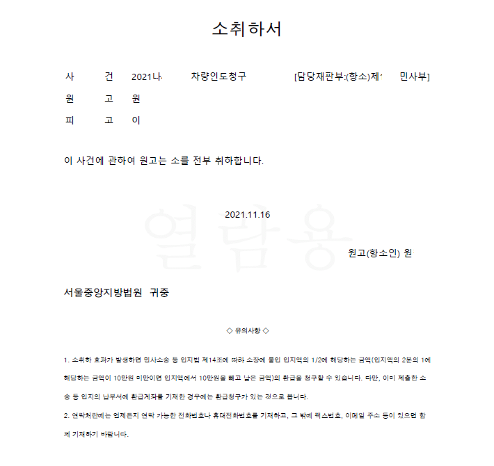 저는 즉각 차량 점유자인 채권자를 피고로 하여 차량인도청구소송 및 차량점유이전금지가처분을 하였고 항소심까지 가는 법적 공방 끝에 피고가 원고에게 차량을 반환하기로 하는 합의를 하여 저희는 소를 취하하였습니다.