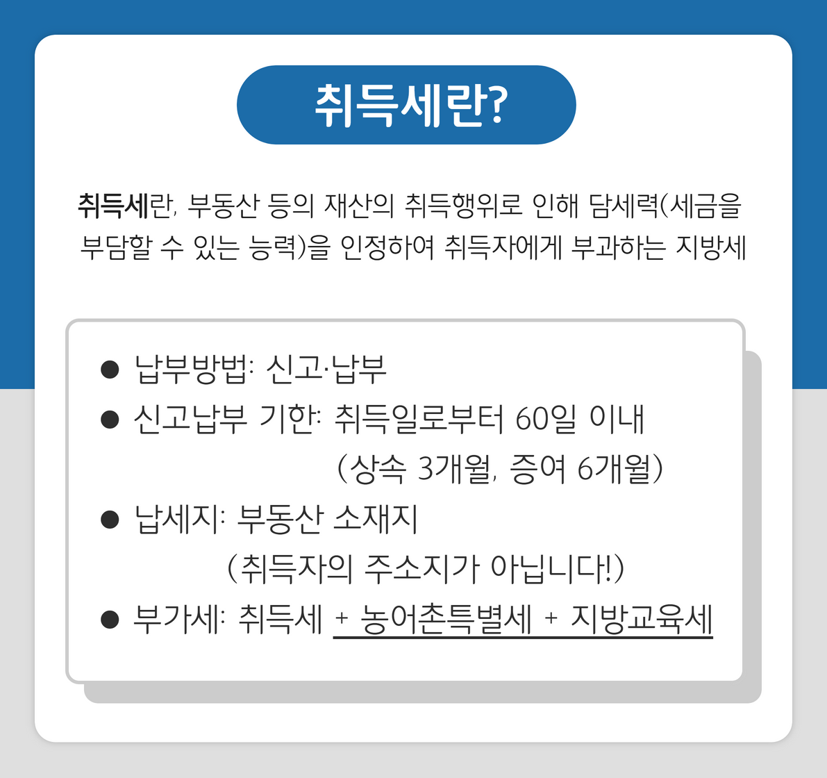 취득세란, 부동산 등의 재산의 취득행위로 인해 담세력(세금을 부담할 수 있는 능력)을 인정하여 취득자에게 부과하는 지방세입니다.