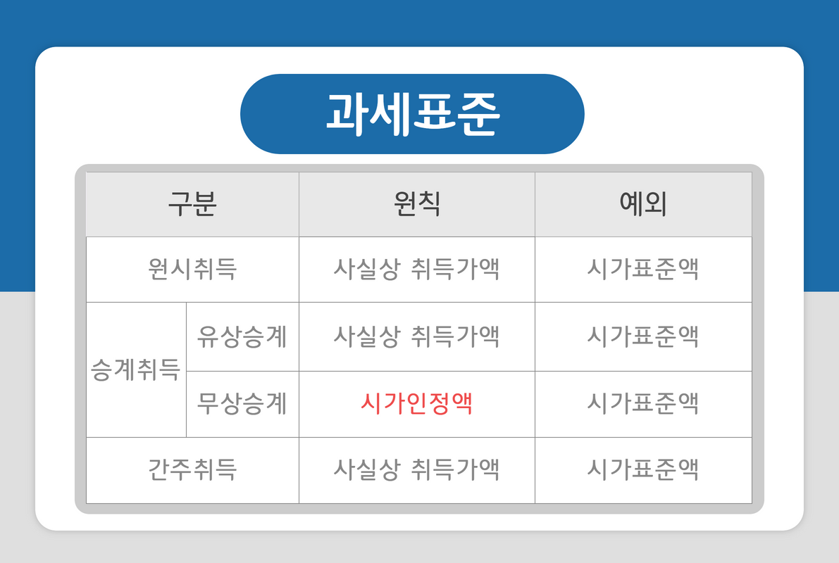 기본적으로 실제로 취득한 금액이 과세표준입니다. 하지만, 신고가액이 없거나 신고가액이 시가표준액보다 적은 경우 등, 실제 취득가액을 적용하기 어려운 경우에는 예외적으로 시가표준액을 적용하게 됩니다. 여기서 주의하실 점은 무상승계의 경우, 기존에는 시가표준액으로 과세표준을 삼았다면 2023년부터는 시가인정액으로 바뀐다는 점입니다. 상속이나 증여와 같은 무상승계의 경우, 금액을 알 수 없기 때문에 시가표준액을 적용했었는데요. 내년부터는 시세를 반영하는 시가인정액을 적용하기로 했기 때문에 과세표준이 증가하여 세액도 올라갈 것으로 보입니다.