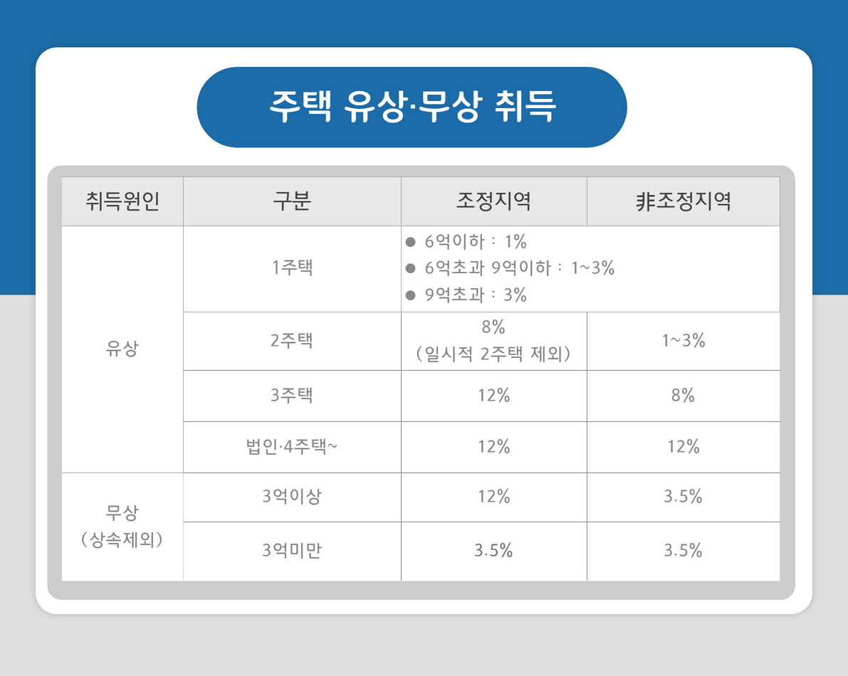 취득세는 취득가, 보유 주택 수, 조정대상지역 여부 등에 따라 세율이 다르게 적용됩니다.