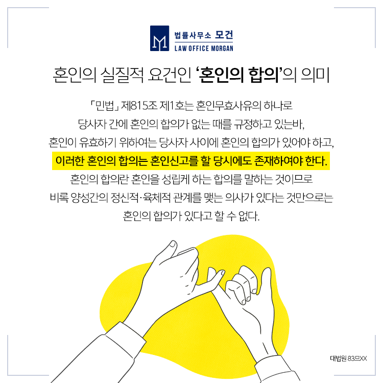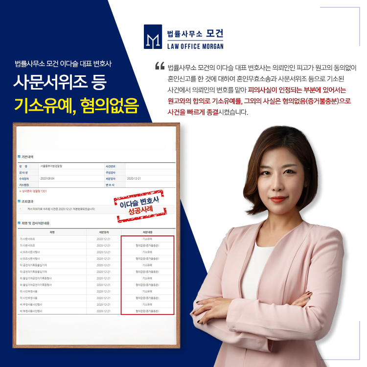 법률사무소 모건의 이다슬 대표 변호사는 대한변호사협회등록 이혼전문변호사로, 일방의 혼인신고서 제출로 인한 사문서위조 등의 형사고소 사건과 혼인무효소송을 맡아 방어한 성공사례를 보유하고 있습니다. 종로, 마포, 혜화, 광화문 등 혼인무효소송 관련 상담이 필요하신 분들은 법률사무소 모건으로 문의하시기 바랍니다.