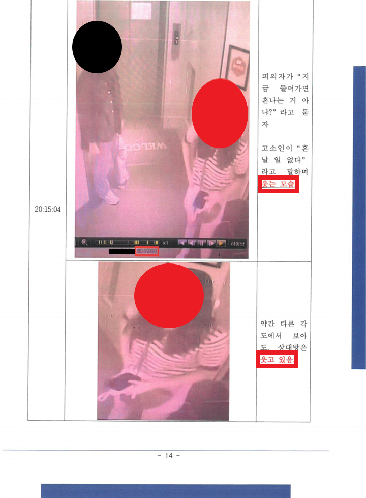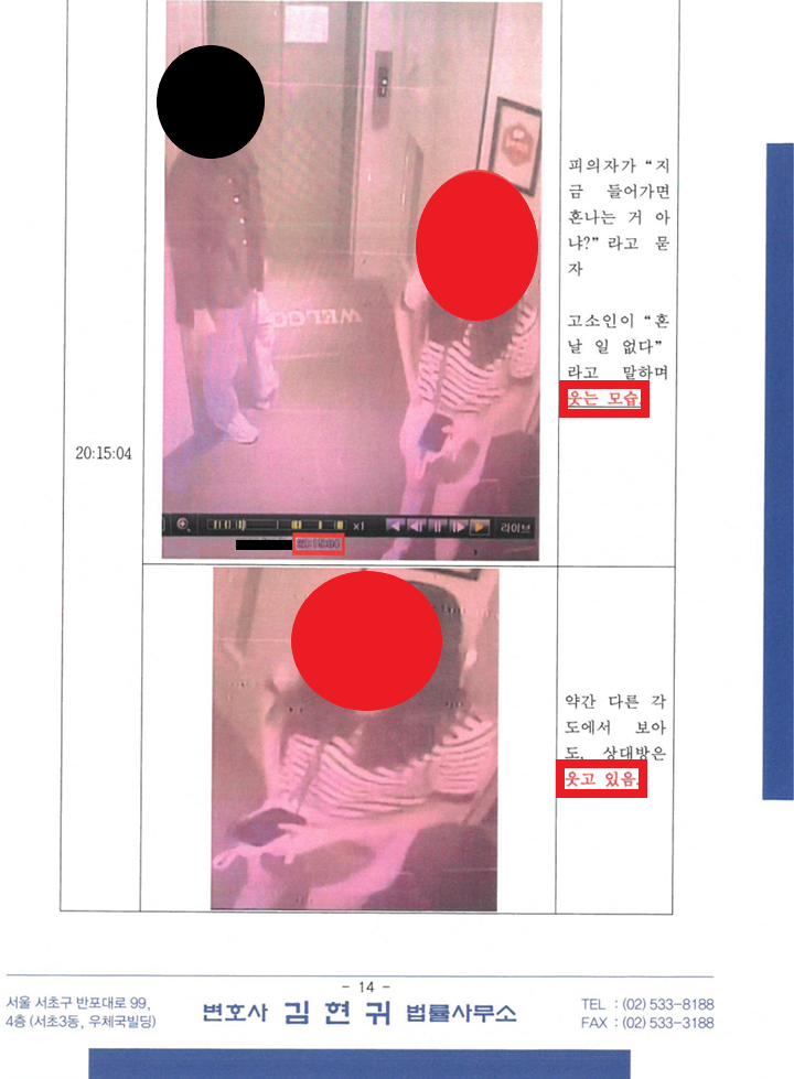 방문 당시 사장이 아닌 직원분이 계셨습니다. 사건 내용을 설명하니 "상대방 여성이 그 날 영상을 보내달라고 해서 문자로 보내줬다. 내 폰에는 영상이 있다"라고 하였습니다. 간곡히 부탁하여 그 영상들을 확보할 수 있었습니다. (고소인은 영상을 확인 후 불리하다고 판단하여 제출하지 않은 것으로 추정됨)