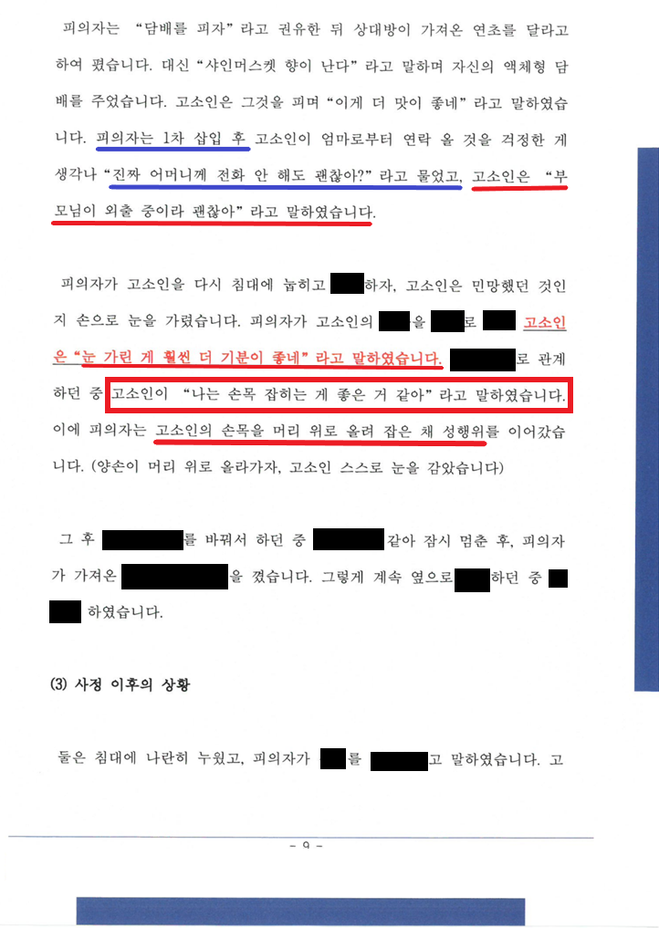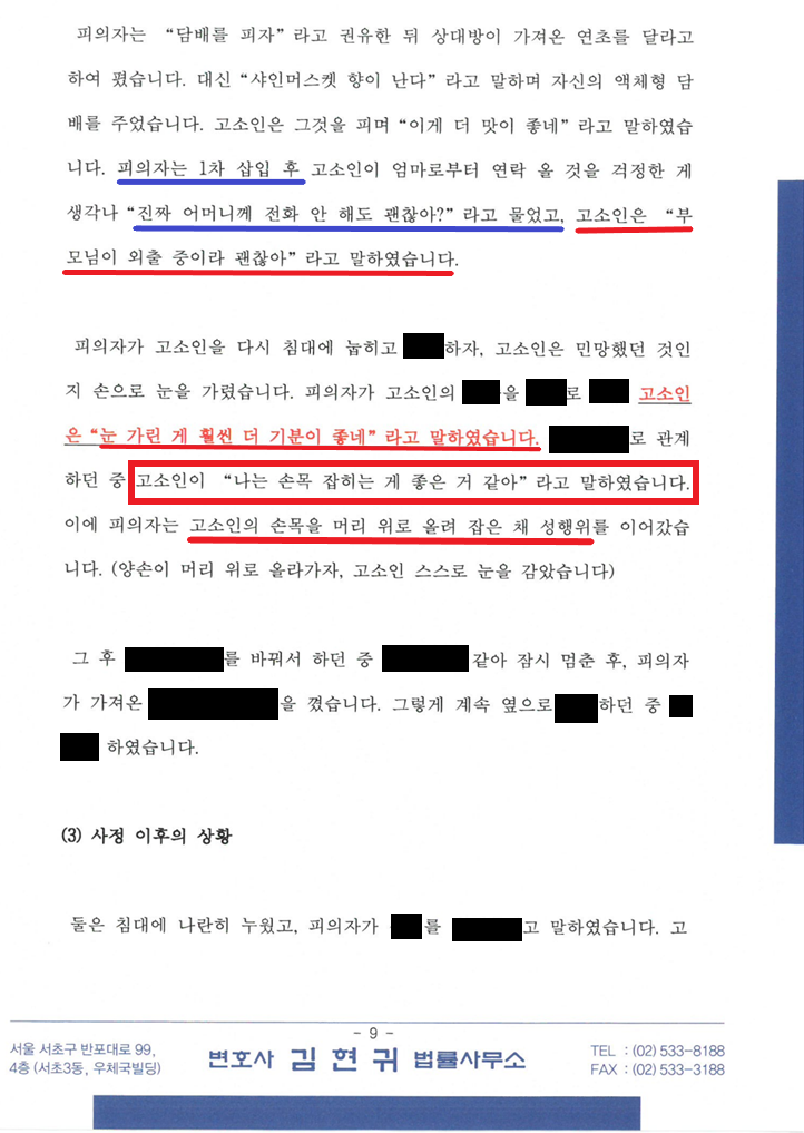 B는 모텔 출입 전, 후를 불문하고 장난치며 웃었습니다. 그리고 성관계 당시에는 매우 적극적이었습니다. 그런데 엄마의 전화를 받고 황급히 나간 후, 갑자기 돌변하여 고소하였습니다.