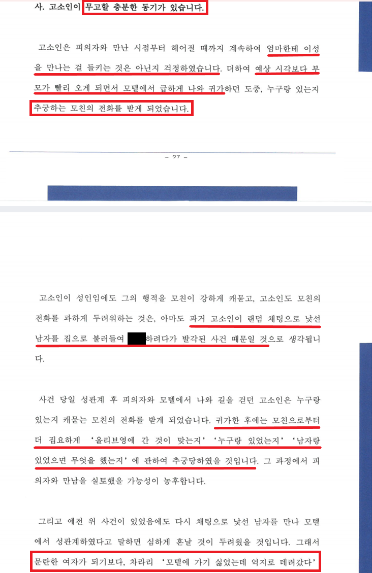 성범죄 피의자로서 혐의를 부인하면, 항상 수사관들은 "근데 그 여자가 왜 허위로 고소하겠어요?" "그 여자가 앙심을 품을 만한 이유가 있나요?"라고 묻습니다. 저는 B가 엄마에게 '낯선 남자와 모텔에 간 사실'을 들키자 둘러대는 과정에서 허위로 성범죄 피해를 만들어냈다고 추정하였습니다.