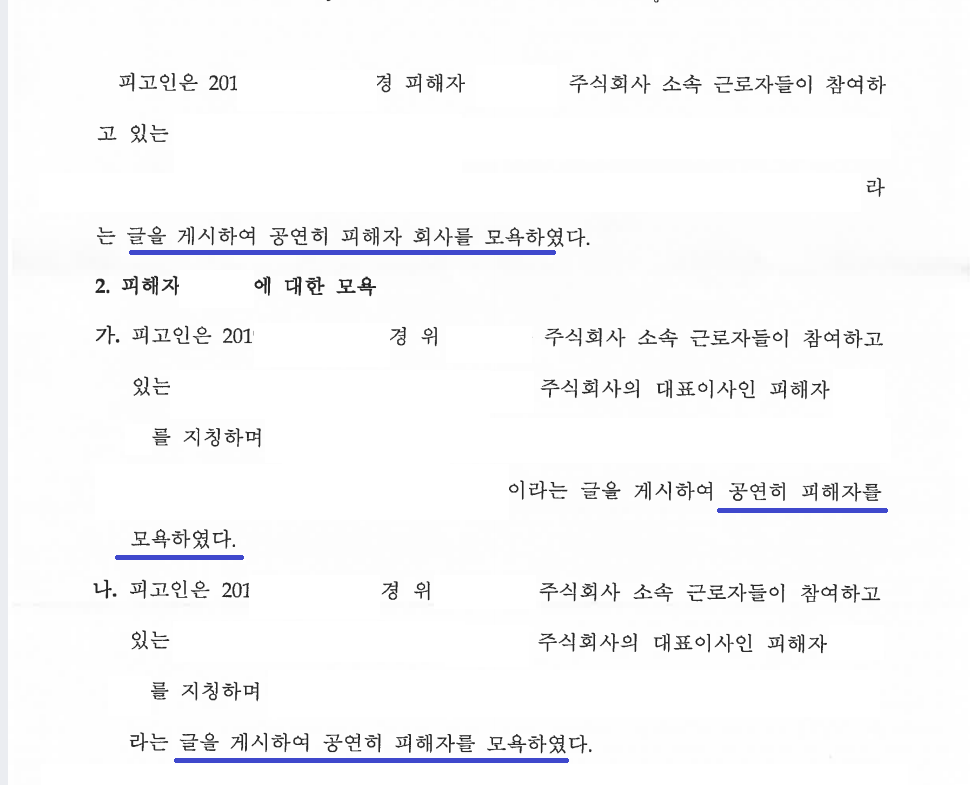 최민형 변호사는 카카오톡 단체 대화방에서의 상당한 양의 대화 내용을 면밀히 확인하였고, 해당 근로자의 표현 중 모욕죄에 해당하는 내용을 범죄일람표로 정리하여 고소를 진행하였습니다. 결국 검찰은 해당 근로자에게 약식명령으로 벌금 70만 원을 청구하였고, 해당 근로자는 의뢰인 및 회사에 대한 비방·모욕 행위를 그만두게 되었습니다.