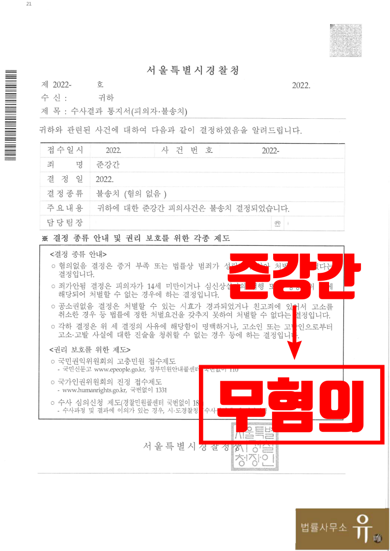 서울경찰청은 법률사무소 유(唯)의 성범죄전문변호사가 작성한 변호인의견서 내용을 대폭 수용하여 피해자의 진술만으로 준강간죄의 공소사실에 대한 증명이 있다고 단정하는 데에는 무리가 있다는 이유로 ‘불송치(혐의없음)' 처분을 하였습니다.