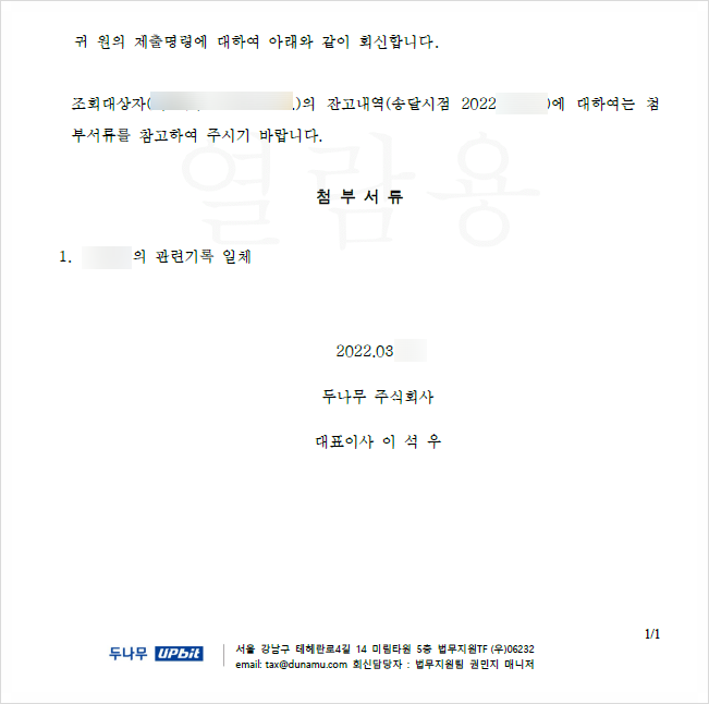 법원을 통해 금융거래정보조회신청 및 문서제출명령신청을 하면 업비트와 빗썸에서 조회 당시 당사자의 예수금 및 코인자산 현황을 알려주게 됩니다.