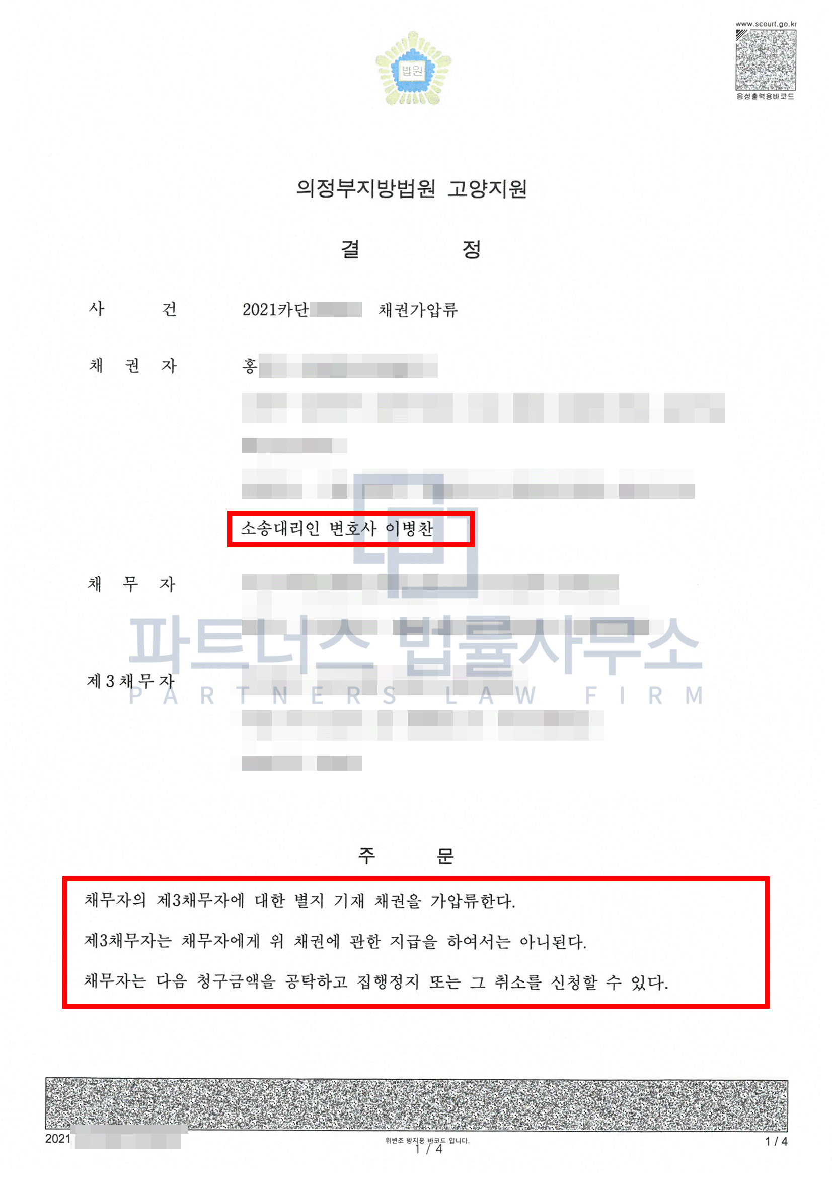 의뢰인의 경우 신종 보이스피싱 수법인 로맨스스캠으로 3,200만 원을 상대방이 알려준 계좌로 입금하여 보이스피싱 피해를 입을 뻔 하였지만, 전통적인 보이스피싱 수법이 아니라는 이유로 보이스피싱을 원인으로 한 계좌지급정지가 불가능한 상황이어서 저희 파트너스법률사무소의 도움으로 재빠르게 일반 가압류를 진행하여 피해금액이 빠져나가는 것을 방지한 사안입니다.