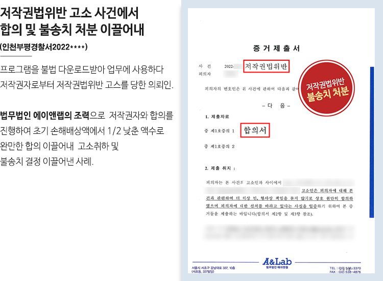 이로써 의뢰인은 신상민 변호사의 전문적인 조력으로 저작권자와의 완만한 합의 및 저작권법위반으로 인한 처벌에서 벗어날 수 있게 되었습니다.