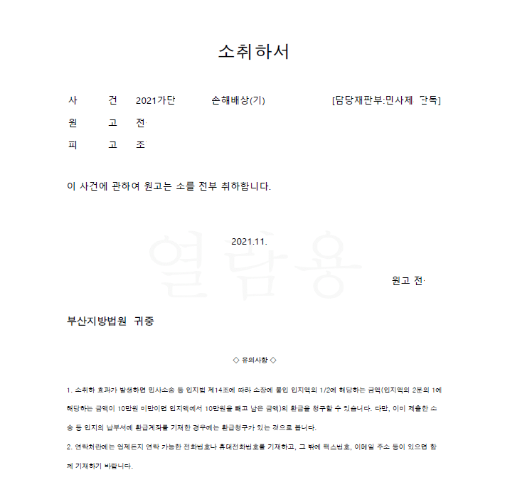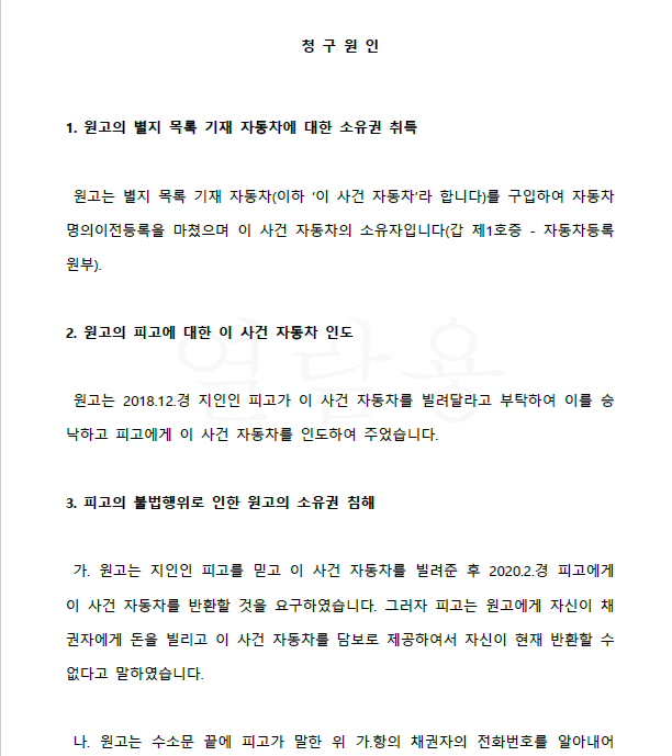저는 즉각 지인을 피고로 하여 차량 가액 상당액에 해당하는 불법행위 손해배상청구소송을 제기하였고 소장을 받은 피고는 법적 책임을 피하기 위해 채권자로부터 차량을 회수하여 의뢰인에게 돌려주었습니다. 이에 따라 저희는 소를 취하하였습니다.