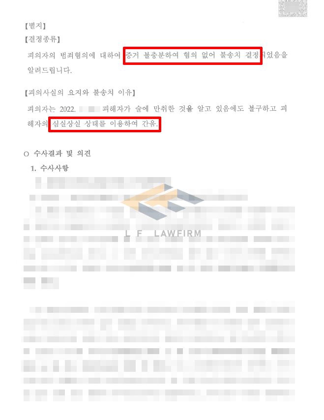 의뢰인은 대학교 한 동아리에서 피해자와 만나 서로 연락을 주고 받던 중 둘이 만나 술을 마시게 되었고, 술을 어느 정도 마신 뒤 모텔로 이동해 성관계를 맺게 되었는데, 이후 피해자가 자신은 기억이 나지 않는 다며 의뢰인을 준강간죄로 고소를 하였고, 이에 의뢰인은 준강간죄로 수사기관의 조사를 받게 되었습니다.