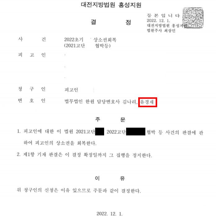 법원은 본 변호인의 주장을 받아들여 피고인의 상소권을 회복한다는 결정을 내렸습니다.