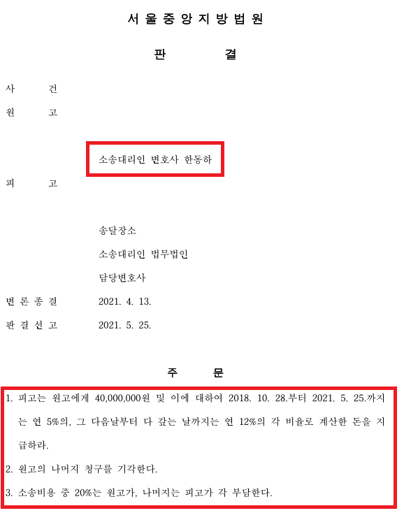 다행스럽게도 재판부께서 피해자의 아픔에 공감하여 위 청구금액 중 40,000,000원을 인용하였습니다(청구금 대비 80% 인용).