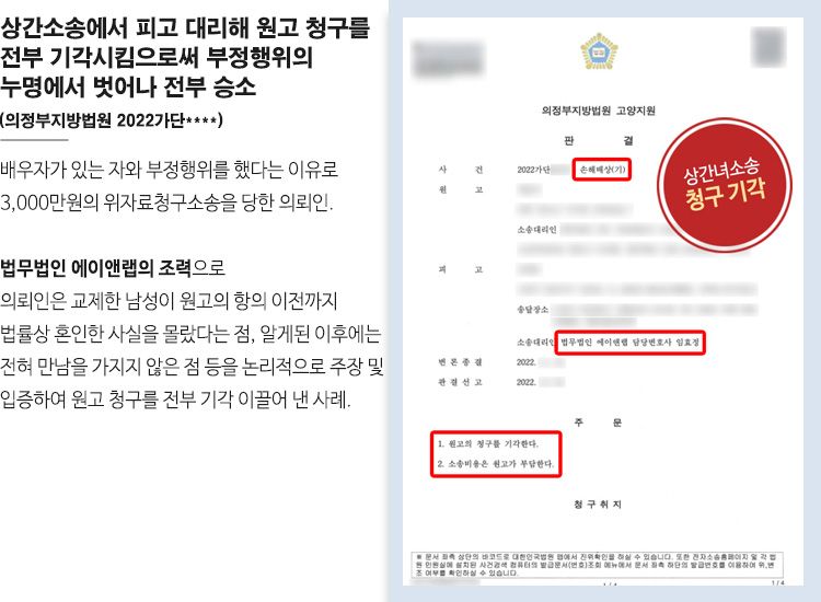 이와 같은 타당한 변론에 사건을 담당한 의정부지방법원에서는 이례적으로 원고의 위자료 청구 전체를 기각시키는 판결을 내려주었습니다.