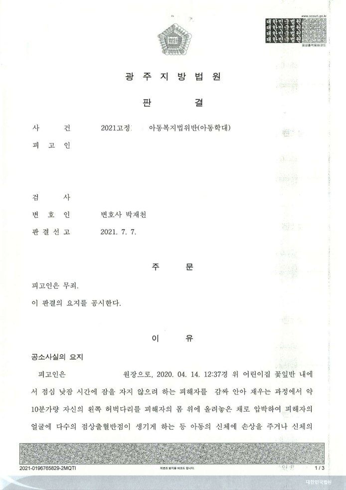 본 사례는 어린이집 원장이 아동에게 잠을 재우려고 한 행위에 대하여 아동학대를 이유로 고소한 사안이었습니다. 아동의 부모는 아동의 얼굴에 생긴 점상출혈반점을 이유로 고소하였으나 해당 점상출혈반점은 단순히 아동이 울기만 해도 생기는 증세이며, 치료를 요하지 않는 것으로 아동학대와 무관하다는 점을 증명하여 무죄판결을 이끌어냈습니다. 어린이집 입장에서는 이러한 일로 말미암아 형사처벌을 받을 시 행정적 제재를 받아 어린이집의 영업이 정지될 위험에 처할 수 있어서 정신적인 고통을 받았던 상황이었습니다. 다행히 어린이집은 아무런 피해를 입지 않고 사건이 종결될 수 있었습니다.