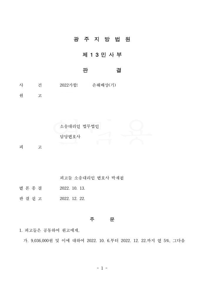저는 임대인인 피고를 대리하여 원고의 청구가 과다하며, 그 인과관계를 증명할 자료도 없음을 여러 방면으로 주장하여 성공적인 판결을 이끌어 낼 수 있었습니다. 원고는 과도한 청구금액을 구했기 때문에, 소송비용확정 절차에서 900만 원 이상의 변호사 비용을 부담하게 될 것으로 예상됩니다.