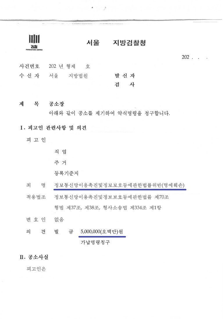 검찰은 피고소인에게 약식명령으로 벌금 500만 원을 청구하였고, 피고소인은 의뢰인에게 사과를 하고 용서를 구하였으며 게시글을 삭제하였습니다.