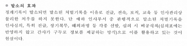 그런데 이러한 공식적인 규정에 의한 경우보다 더 중요한 점은 진급이나 장기복무, 해외파병, 군무원선발 등 각종 선발, 심의 시 비공식적으로 말소된 과거 징계기록을 활용한다는 점입니다.