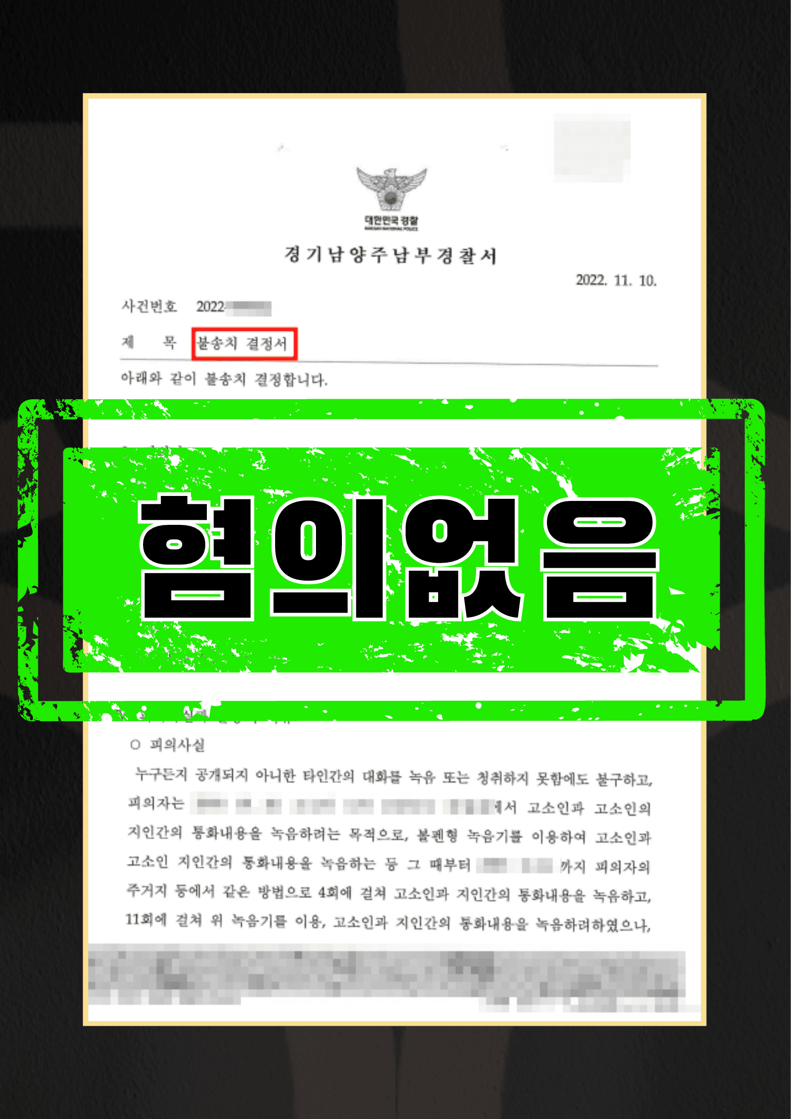 의뢰인은 결혼 생활 중에 남편의 폭력에 방어하고 증거를 남기기 위해 남편의 폭력이 시작될 때마다 녹음기로 녹음을 했는데, 녹음기를 미처 끄지 못한 경우 다른 사람의 대화가 녹음되기도 하였습니다. 그러다가 남편이 우연히 녹음기를 발견, 의뢰인을 통신비밀보호법위반으로 고소를 하게되어 경찰 조사를 받게 되었습니다. 의뢰인은 현재 공무원 신분이라 반드시 혐의없음 결정을 받아야 하는 상황이었습니다.