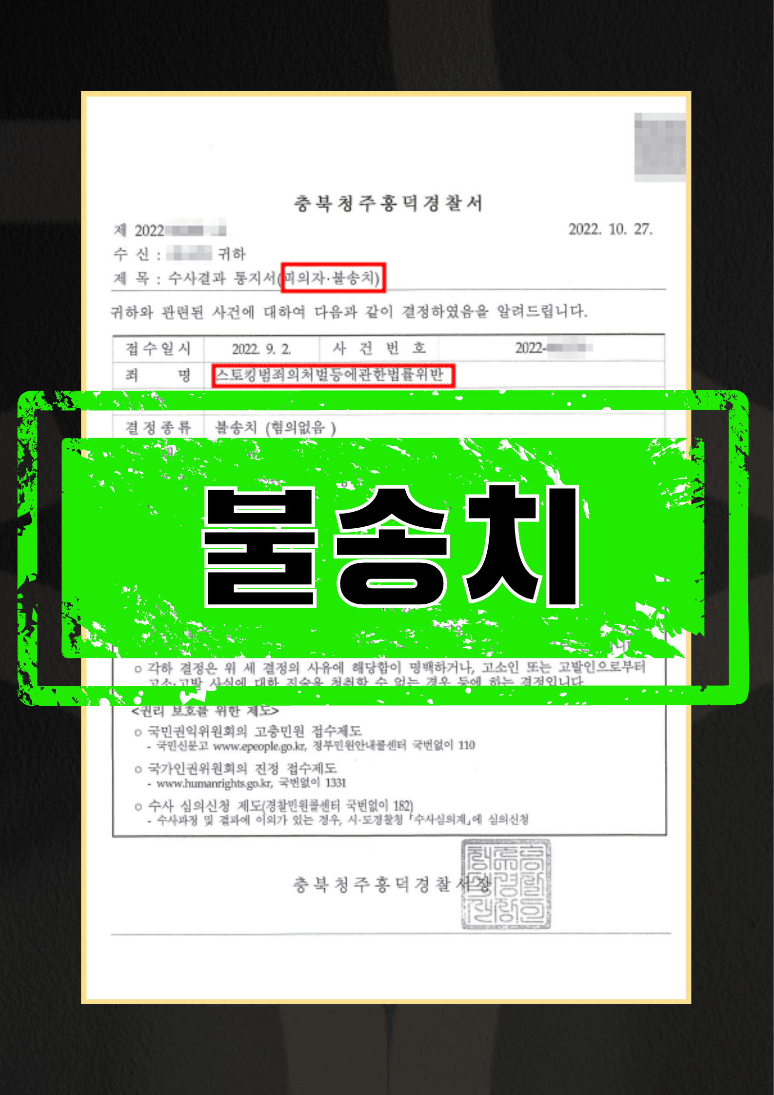 온강의 변호인은 의뢰인과 함께 '의뢰인과 고소인이 헤어진 사실이 전혀 없다는 사실', '한국 입국 당일 고소인과 연락이 되지 않은 사실' 등에 대해 항공권 예매 내역, 문자메시지 등 관련 자료들을 충실하게 수집하였습니다. 이에 의뢰인이 고소인에게 연락할 수 밖에 없었던 사실관계에 대해 최대한 입증을 하려고 노력하였습니다. 아울러 스토킹범죄 관련 '정당한 이유'에 대한 논증을 위해 국회의 법제사법위원회 회의록을 참고하여 국회의원들이 '정당한 이유'에 대해서 어떻게 생각하고 입법했는지 확인 후, 그 입법자의 의도를 반영한 법리 논증을 의견서를 통해 피력했습니다. 이에 경찰은 의뢰인의 행동에 '정당한 이유'가 있다고 보아 불송치(범죄인정안됨) 결정을 하였습니다.