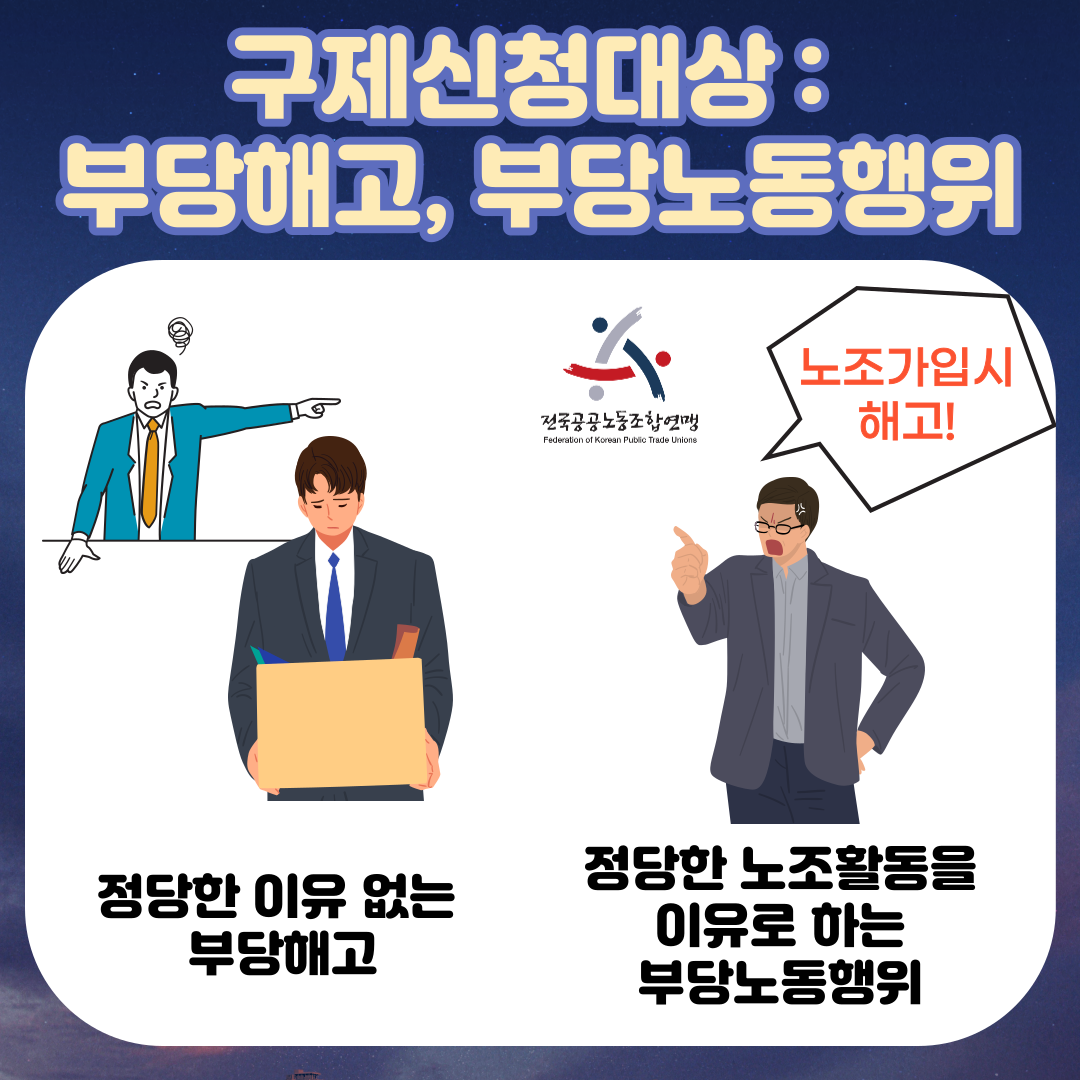 근로기준법 제 23조 제1항에 따라 사용자는 정당한 이유없이 해고ㆍ휴직ㆍ정직ㆍ전직ㆍ감봉 기타 징벌을 할 수 없는데요, 정당한 이유 없는 부당해고나 부당징계를 당한 근로자는 노동위원회에 구제신청을 할 수 있습니다.