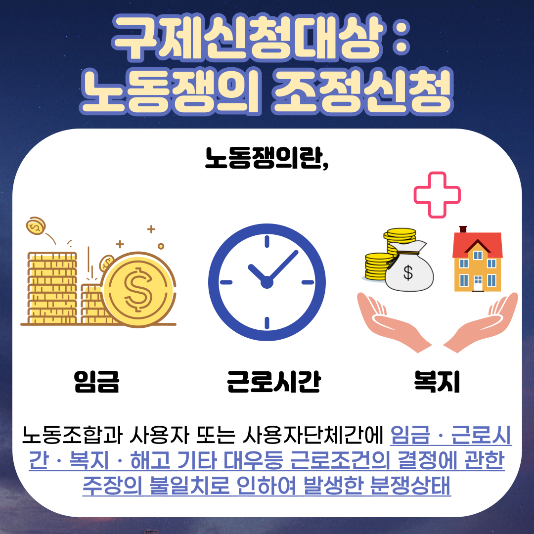 노동위원회에 구제신청 대상이 될 수 있는 것들은 부당해고ㆍ징계, 부당노동행위, 차별적 처우 등이 있습니다.