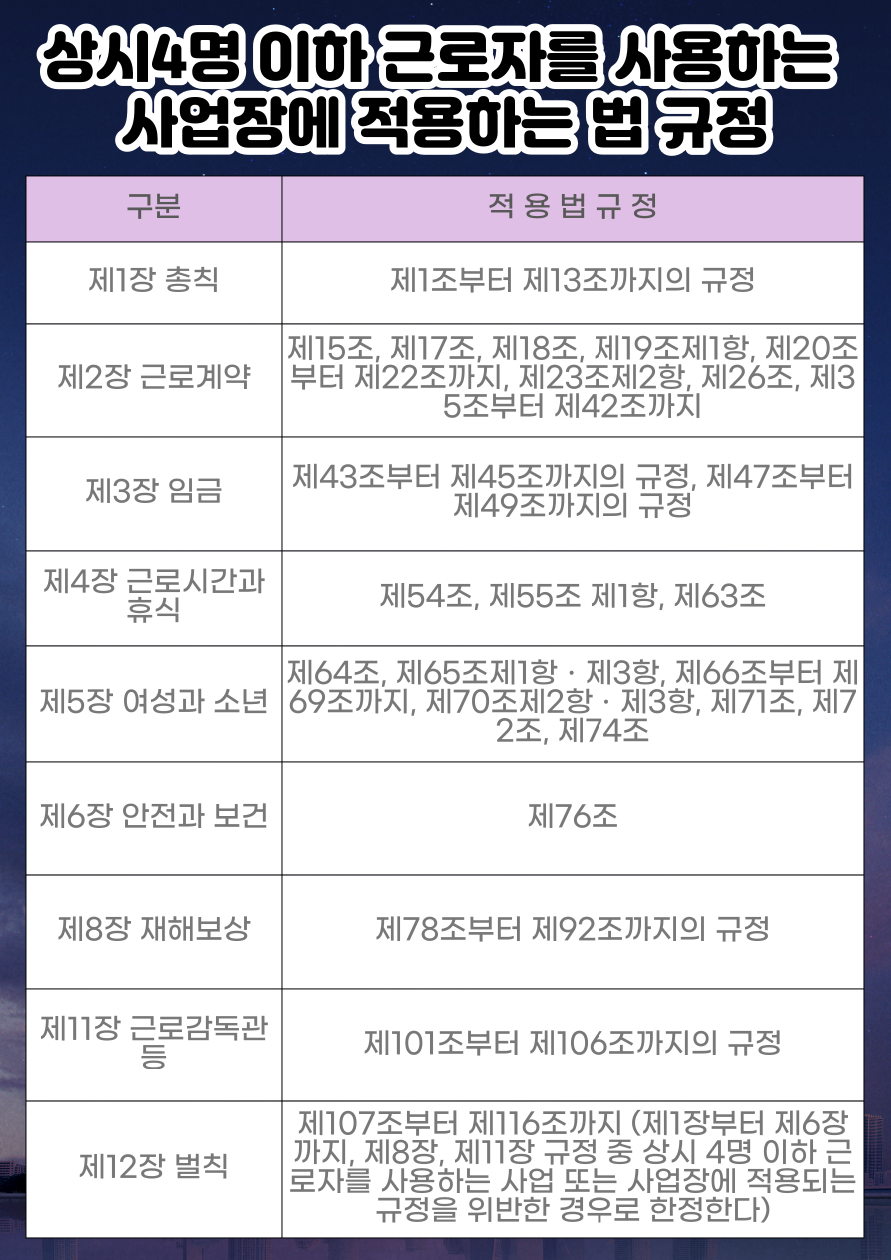 「 상시 4명 이하 사업장 근로기준법 적용 규정 」