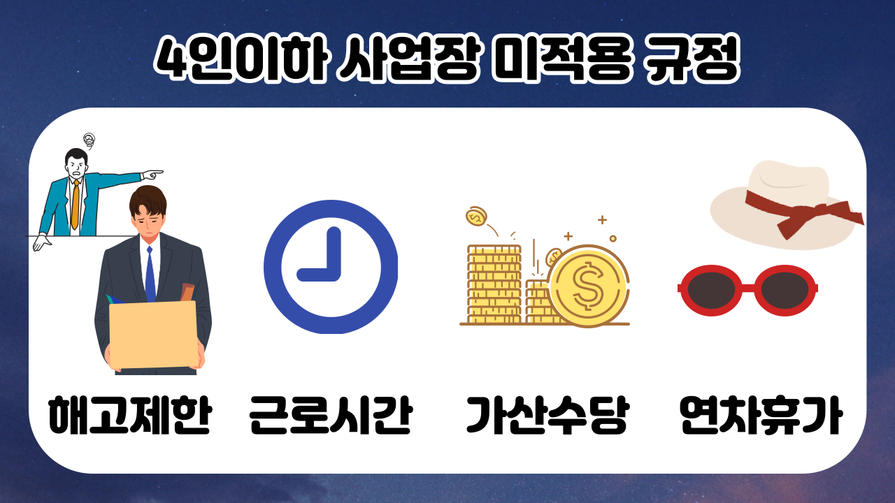 안녕하세요, 오늘은 4인 이하 사업장에 적용되는 근로기준법과 적용되지 않는 근로기준법에 대해서 알아보겠습니다.