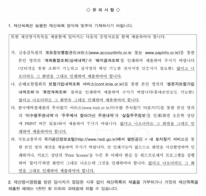 재산명시명령을 신청하면 법원은 재산명시명령을 결정하고 그 결정서에는 아래와 같은 유의 사항이 포함되어 있는데, 이를 살펴보면, 우리나라에서 경제생활을 하면서 확보면, 은행 계좌, 부동산, 주식계좌, 보험 내역을 모두 확인할 수 있어 사실상 당사자 명의 재산을 모두 확보할 수 있습니다.