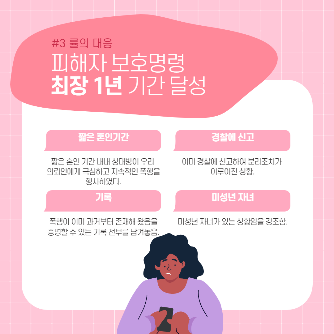 이를 위하여 본 사무실에서는 의뢰인과 상대방 배우자가 2020년 혼인 신고를 마쳤으며, 미성년 자녀가 1명 있는 상황임을 강조하면서 짧은 혼인 기간 내내 상대방이 우리 의뢰인에게 극심하고 지속적인 폭행을 행사하였다는 점, 이미 의뢰인이 상대방을 가정폭력으로 경찰에 신고하여 분리조치가 이루어진 상황이라는 점을 주력하여 최장 기간의 피해자 보호명령 결정을 받을 수 있도록 노력하였습니다.