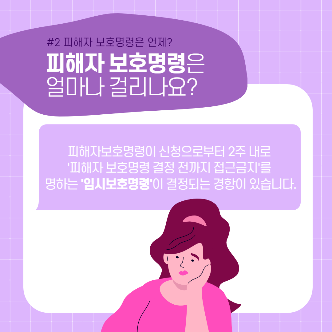 피해자 보호명령을 신청하는 경우, 폭행의 정도에 따라 다르기는 하지만, 상해에 이르는 폭행이 과거에 존재하였다면 피해자보호명령 신청으로부터 2주 내로 ‘피해자 보호명령 결정 전까지 접근금지’를 명하는 ‘임시보호명령’이 결정되는 경향이 있습니다.