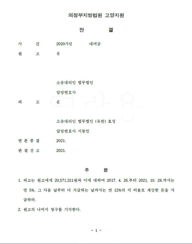 저는 사건을 분석한 후 원고의 대여금 청구액 중 의뢰인이 일부 변제한 금액에 대해 항변하고, 원고는 의뢰인의 직원이 아니었으므로 임금 청구는 부당하며, 원고 대여금 청구액 중 현금으로 지급하였다는 액수는 증거가 없다고 다투었습니다. 법원은 저희의 주장을 모두 받아들여 원고 일부 패소 판결을 선고하였습니다.