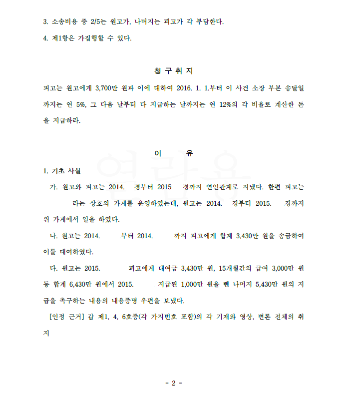 의뢰인은 원고와 연인 관계였고 돈을 빌렸는데 원고는 의뢰인과 헤어진 후 대여금과 자신이 의뢰인의 가게에서 일하면서 못 받은 임금을 달라며 이 사건 소를 제기하였고 의뢰인은 저를 찾아오셨습니다.