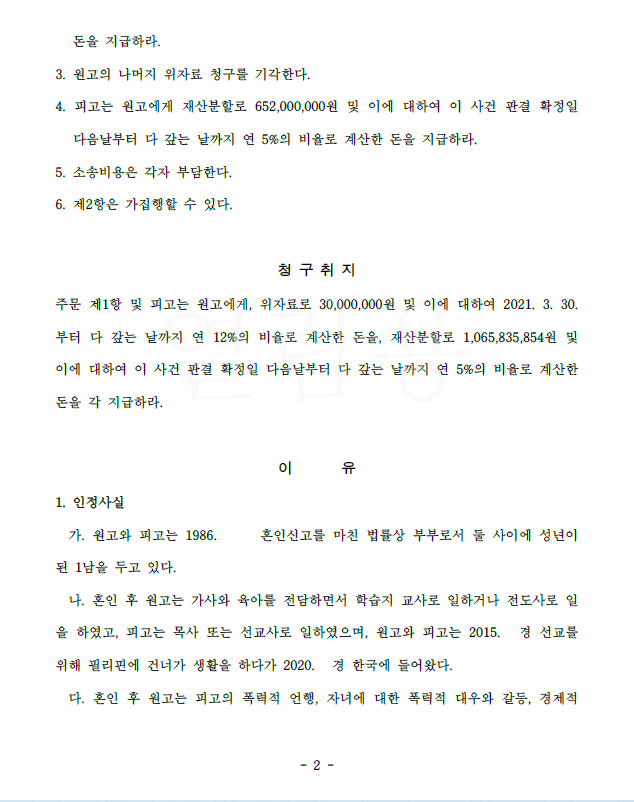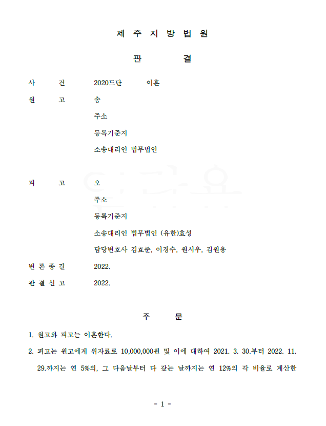 저는 즉각 응소하면서 원고의 위자료 및 재산분할 청구가 법적 근거 없이 지나치게 과다하므로 감액되어야 한다고 주장 입증하였고, 법원은 1,000만 원의 위자료 및 약 6억 원의 재산분할을 명하는 판결을 선고하였습니다.
