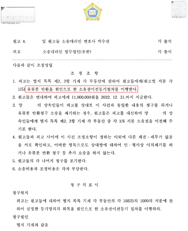 저희 사무실에서는 부동산 등기부등본상 등기원인이 기재되어 있지 않다면 등기부등본상의 권리와 실체관계가 부합하지 않을 가능성이 있기 때문에 여러 자료들을 조사하여 먼저 장남의 명의로 등기된 부동산이 원인무효로 말소되어야 할 것이고, 따라서 장남의 아들인 피고에게 상속을 원인으로 한 소유권 이전등기도 원인무효인 소유권 보존등기에 터잡아 이루어진 무효의 등기이기 때문에 말소되어야 하나, 편의상 진정등기명의의 회복을 원인으로 한 소유권 이전등기를 청구하였으며, 향후 유류분반환청구 소송도 추가로 제기할 계획이었는데, 소제기 후 당사자들 사이에 원만히 합의가 이루어져서 유류분 반환을 원인으로 부동산 중 일부를 등기이전하는 것으로 조정이 성립되었고, 의뢰인 분들과 피고간의 가족 관계도 깨지지 않고 좋은 관계를 유지할 수 있었습니다.