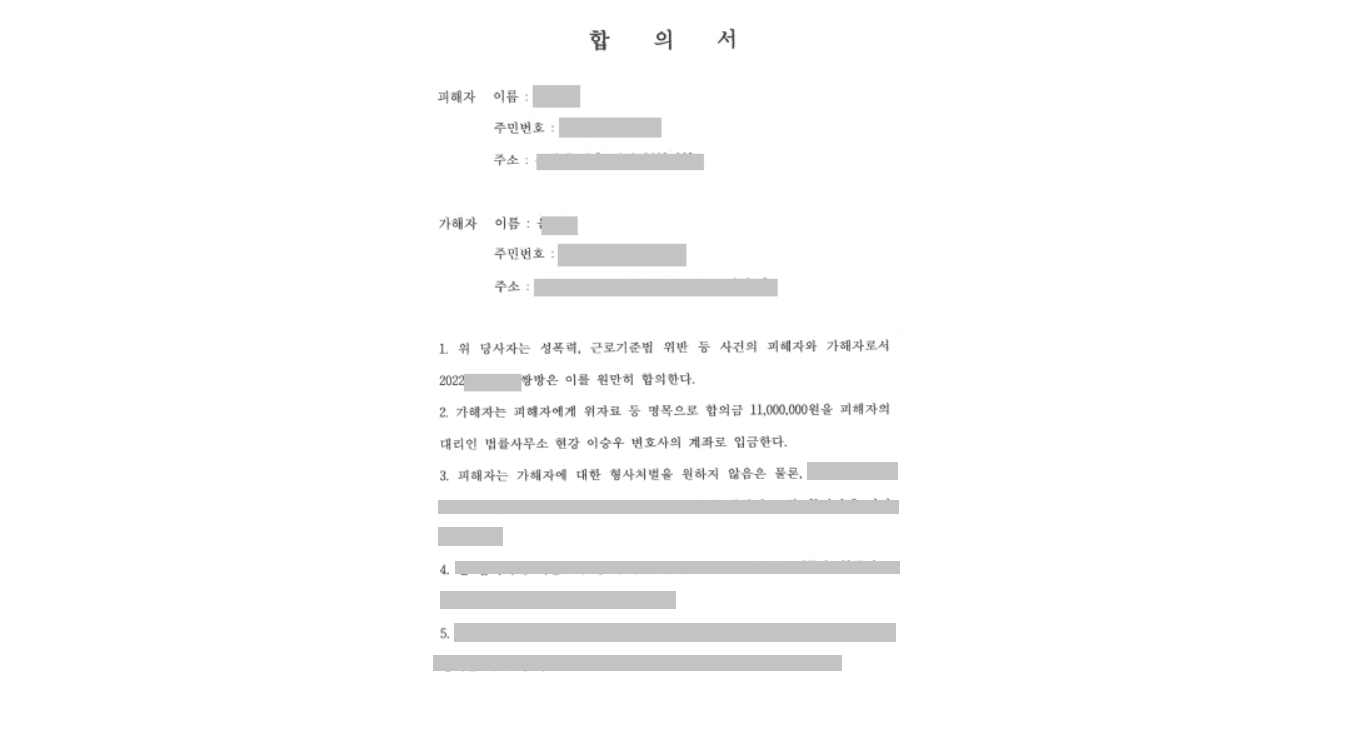 카카오톡 내용과 업장의 CCTV 를 통하여 증거를 수집할 수 있도록 도왔고, 사장이 여태까지의 행위를 인정하는 내용들을 강조하여 고소를 진행하였습니다. 고소 관련 연락이 가자마자 상대방에서는 연락이 왔고 의뢰인분께서 학비 때문에 시작한 알바의 일자리를 잃었으니 1000만원 이상이 아니면 합의하지 않겠다는 입장을 전달하였습니다.
