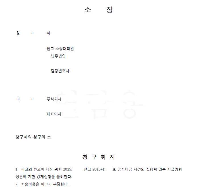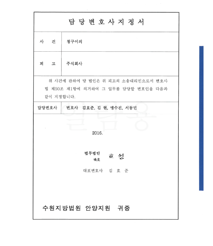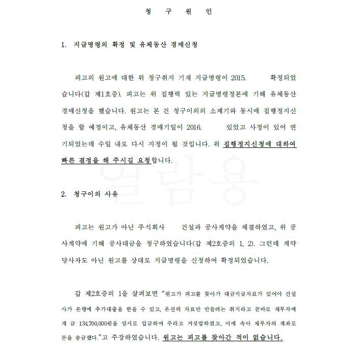 의뢰인은 상대방에게 공사대금에 관한 지급명령을 신청하여 인용 결정을 받고 확정 후 상대방 재산에 강제집행을 개시했는데 갑자기 상대방이 의뢰인을 상대로 청구이의의 소를 제기하고 강제집행정지신청을 하였습니다. 사유는 자신은 공사계약의 도급인이 아니라 제3자가 도급인이므로 자신에 대한 공사대금청구는 부당하다는 것이었습니다.
