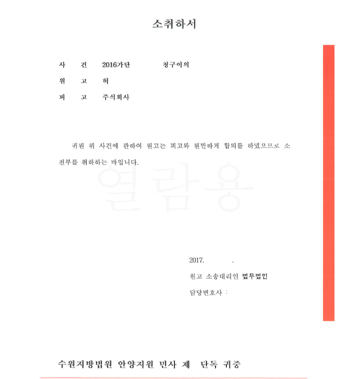 저는 즉각 답변서 등을 제출하면서 이 사건 공사계약의 도급인은 상대방이 맞다는 사실을 주장 입증하였고 결국 상대방과 소송 과정에서 원만히 합의하여 의뢰인은 공사대금을 지급받고 상대방은 소취하를 하였습니다.