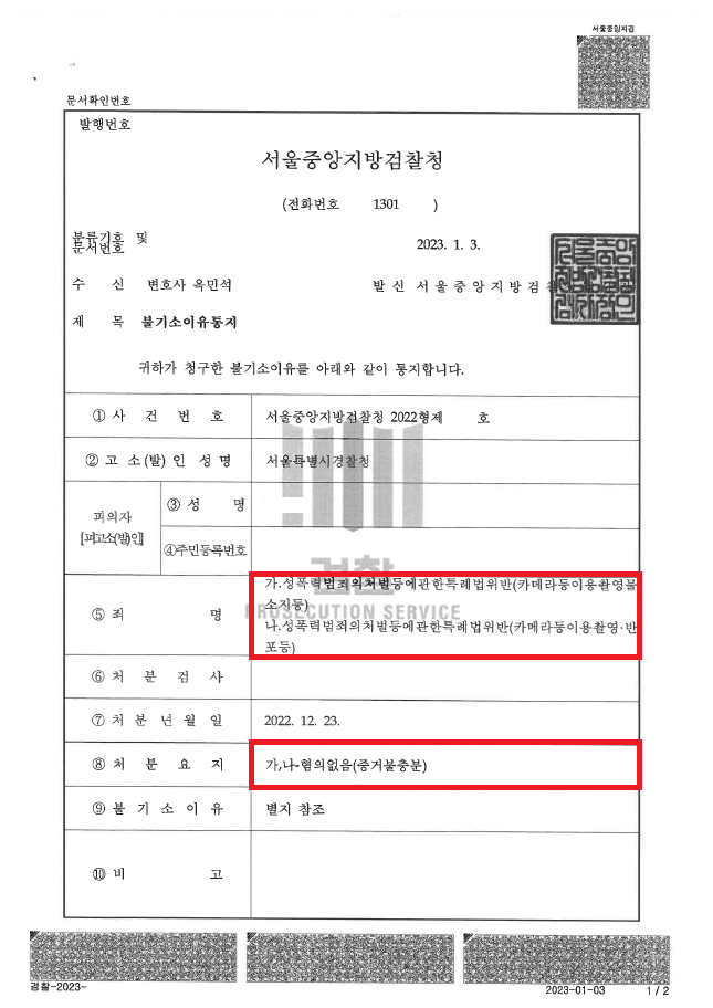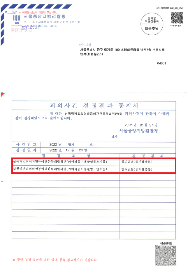 이러한 저의 조력을 바탕으로 A씨는 경찰은 혐의가 인정된다고 판단하여 사건을 검찰로 송치하였음에도 불구하고 '혐의없음(증거불충분)' 처분을 받음으로써 섣불리 대응하였다면 얼마든지 될 수 있었던 '윤XXX'의 '돈XXX' 불법촬영물 관련 성범죄자가 될 위기에서 벗어날 수 있었습니다.