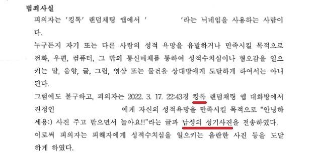 A씨는 2022. 3. 17. 22:43경 여느 때와 마찬가지로 '킹톡'을 하던 중 전혀 모르는 B씨에게 "안녕하세용:) 사진 주고받으면서 놀아요!!"라는 채팅을 전송하고는 다짜고짜 성기 사진을 전송하였습니다. 그러나 B씨는 아무 대답도 없었고, A씨는 '킹톡'에서는 흔히 있는 일이라 대수롭지 않게 여겼습니다.