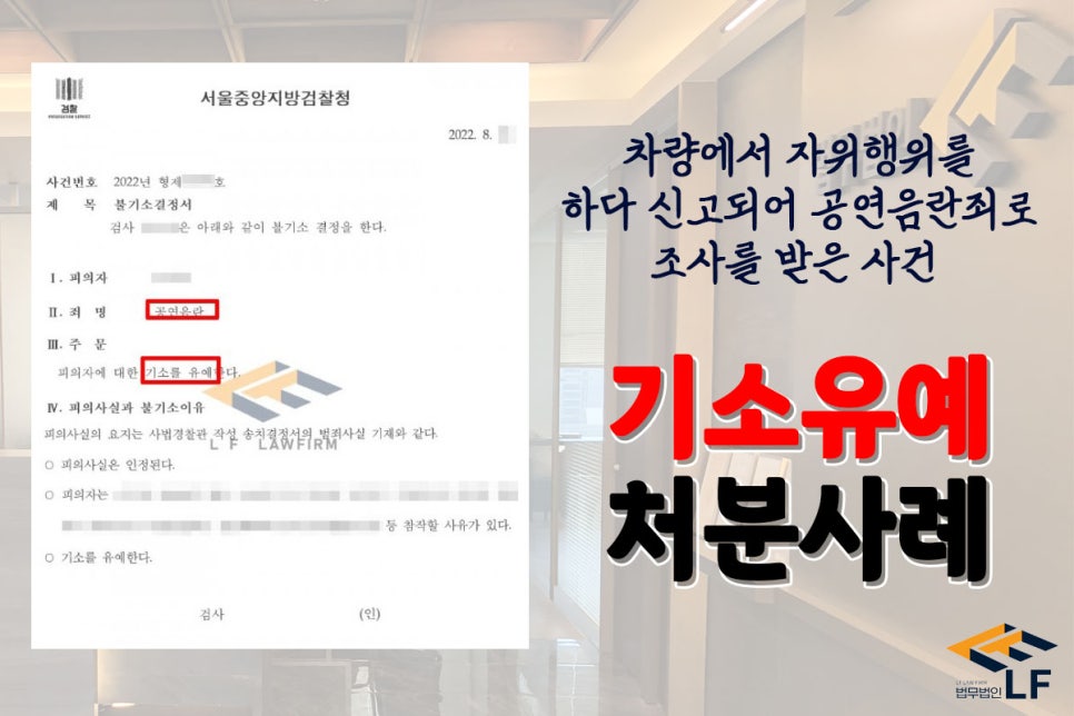 의뢰인은 자신의 차량을 이용하여 이동하던 중 순간적인 성적욕구를 느끼게 되었고, 이에 차량 안에서 자신의 성기를 꺼내 자위행위를 하다 지나가던 피해자에게 발각되어 경찰에 신고가 되어 수사기관으로부터 조사를 받게 되었습니다.
