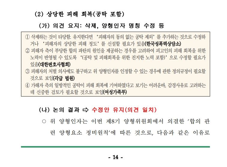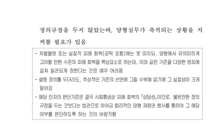 대법원 양형위원회는 2022. 7. 4. 제117차 정기회의에서 ‘성범죄 수정 양형기준’을 의결하면서 “상당한 피해 회복(공탁 포함)”에 관하여는, “처벌불원 또는 실질적 피해 회복(공탁 포함)에는 못 미치되, 양형에서 유의미하게 고려할 만한 수준의 피해 회복을 핵심요소로 하는데, 이와 같은 기준을 다양한 범죄에 걸쳐 일관되게 정하는 것은 매우 어려움”, “설령 정의를 두더라도, 추상적인 기준의 선언에 그칠 수밖에 없기에 그 실효성이 크게 떨어짐”, “해당 인자의 판단기준은 결국 사회통념상 피해 회복의 「상당성」이므로, 불완전한 정의규정을 두는 것보다는 법관으로 하여금 합리적인 양형 재량권 행사를 통하여 그 해당 여부를 판단하도록 하는 것이 바람직함”이유로 정의규정을 두지 않았습니다.