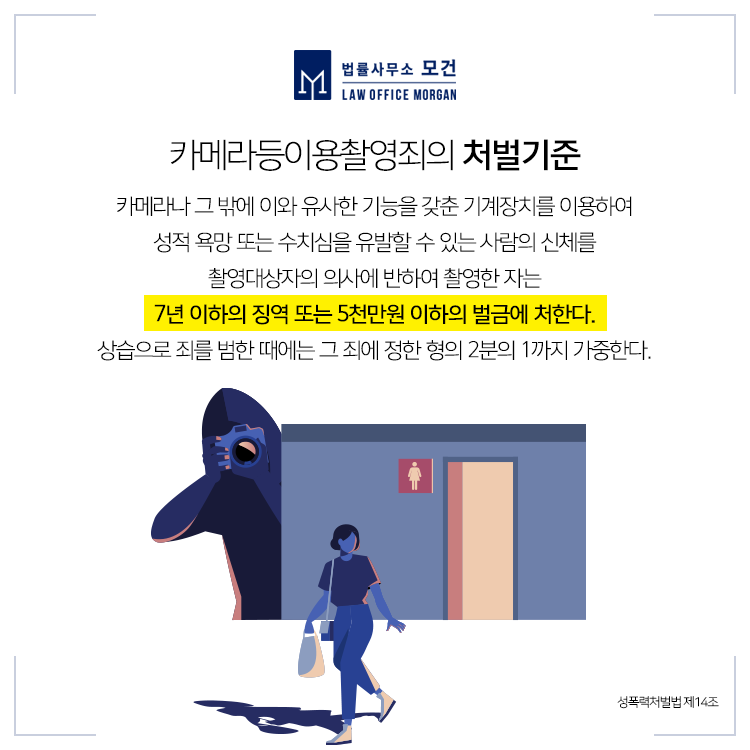 카메라등이용촬영죄는 카메라 등을 이용하여 성적욕망 또는 수치심을 유발할 수 있는 사람의 신체를 촬영대상자의 의사에 반하여 촬영한 자를 처벌하는 것으로, 7년 이하의 징역 또는 5천만원 이하의 벌금으로 처벌되며, 그것이 일회성이라 하더라도 처벌될 수 있습니다.